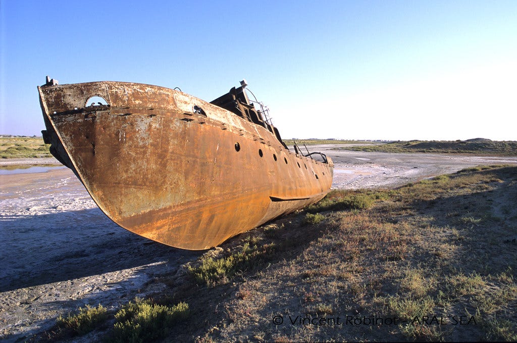 Si elle porte le nom de mer, Aral est en fait un lac… d’eau de plus en plus salée du fait de l’évaporation dont elle est victime. Située en Asie centrale entre le Kazakhstan et l’Ouzbékistan, il s’agissait du 4e plus grand lac au monde avec une surface de 67 000 km² soit, deux fois la taille de la Belgique ! Mais dans les années (19)60, l’URSS alors maîtresse des lieux, décide de cultiver du coton et du blé sur les vastes territoires des steppes plutôt désertiques de la région. Pour réussir ce pari de développer des cultures demandant beaucoup d’eau, une grande partie des fleuves qui alimentent la mer d’Aral est détournée pour irriguer les terres. Ce sont 20 à 60 km³ d’eau qui sont prélevés ainsi chaque année. En 1970, la mer d’Aral avait déjà perdu les 9/10e de sa surface entraînant une explosion de la salinité des eaux et la mort de la plupart des poissons… En 2000, il ne restait plus que deux grandes étendues d’eau, l’une au Kazakhstan et l’autre en Ouzbékistan. Aujourd’hui, la partie Ouzbek a quasiment totalement disparu. Mais, bonne nouvelle, un gros travail a été entrepris avec l’aide de la Banque Mondiale sur la partie Kazakh et le niveau de l’eau remonte régulièrement depuis 2005. Les prises de poissons ont été multipliées par 6 en 10 ans, ce qui redonne un coup de fouet à l’activité économique de la région. Mais ce qui reste de la mer d’Aral (7 300 km²) est toujours en danger, notamment avec les changements climatiques et les sécheresses qui s’enchaînent (voir aussi notre article ici).